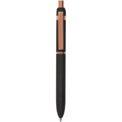 Metal. Cuerpo de aluminio, acabado engomado color negro, muy suave al tacto. Bolígrafo retráctil. Clip, botón y anillos metálicos color cobre. Tinta Azul. Decapa cobre tanto en el cuerpo como en la tapa. Presentación en caja de regalo.